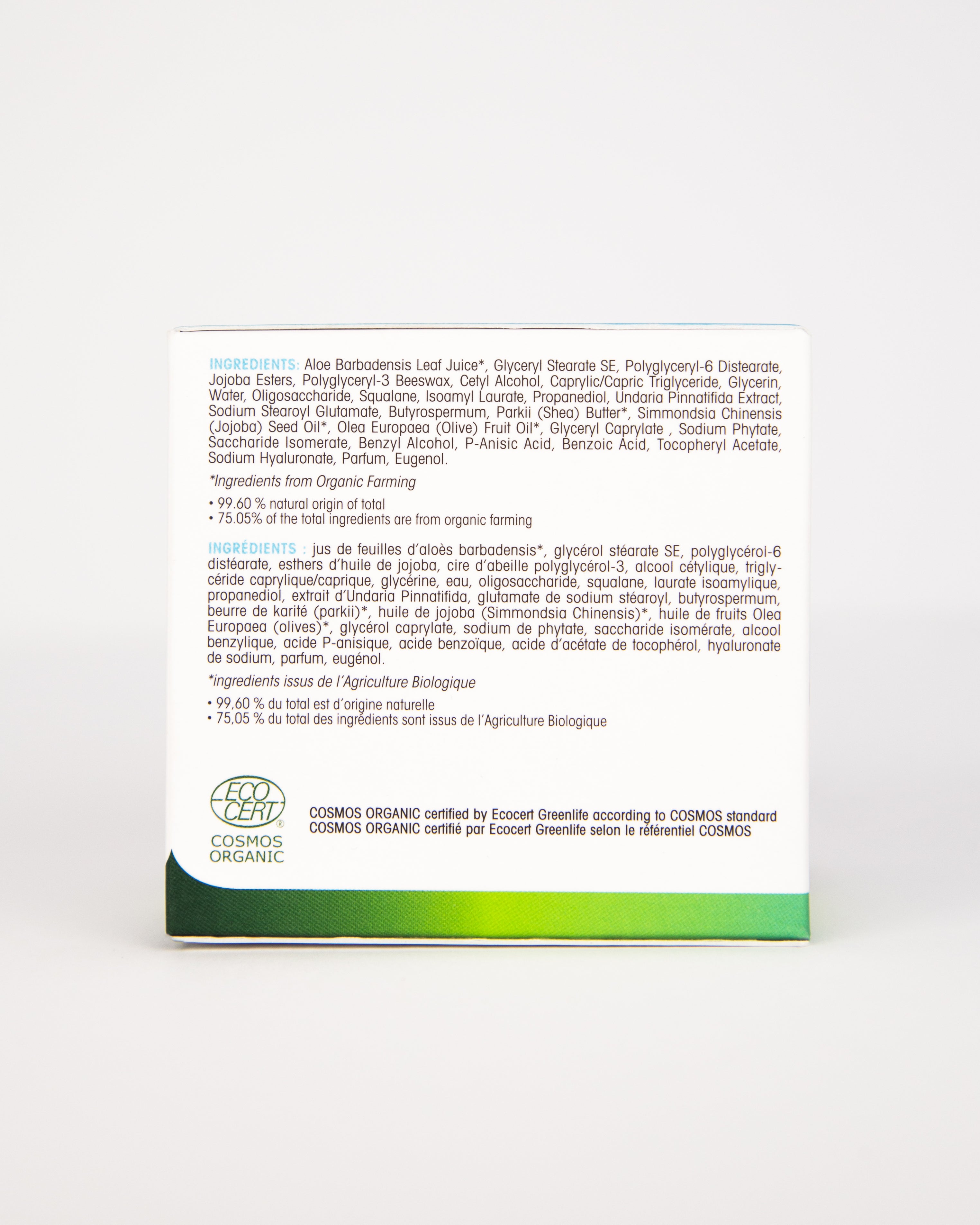 Aloe barbadensis Leaf Juice, Glyceryl Stearate SE, Polyglyceryl-6 Distearate, Jojoba Esters, Polyglyceryl-3 Beeswax, Cetyl Alcohol, Caprylic/Capric Triglyceride, Glycerin, Water, Oligosaccharide, Squalane, Isoamyl Laurate, Propanediol, Undaria Pinnatifida Extract, Sodium Stearoyl Glutamate, Butyrospermum, Parkii (Shea) butter, Simmondsia Chinensis (Jojoba) Seed oil, Olea Europaea (Olive) Fruit oil, Glyceryl Caprylate , Sodium Phytate, Saccharide Isomerate, , Benzyl Alcohol, P-Anisic Acid, Benzoic acid, Tocopheryl Acetate, Sodium Hyaluronate, Parfum, Eugenol.